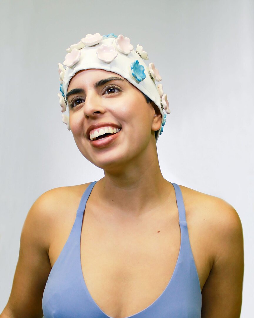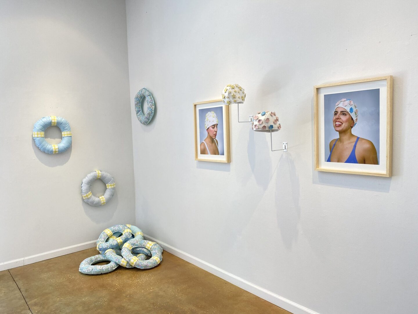 “We don’t fit in the past; nor do we know the future. We are looking to swim freely, and safely amidst chaos and fear. Space Swim echoes the hope found in astronaut portraits, and sunny days by the pool. It is in searching and developing one’s identity that we find ourselves in a space that is free from burdens, even if the so-called free space is in a constructed experience of a pool.