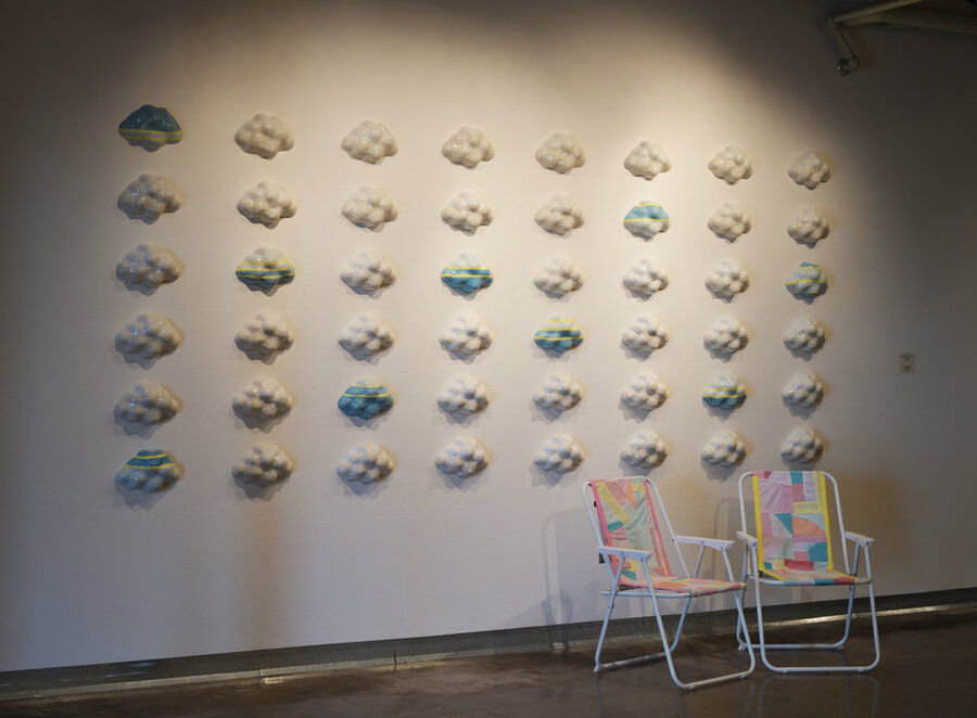 “Working through the weight of identity, I use colors and a sense of playfulness to engage with the viewer. I am stepping away from the real and creating objects that lose their functionality but are a metaphor for hope, memory and environment.”