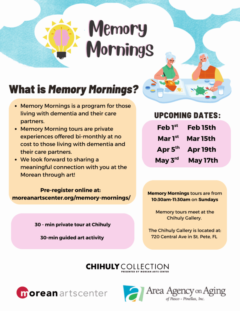 Memory Morning participants will receive a 30-minute private tour of the Chihuly Collection before opening hours, followed by a 30-minute guided art activity inspired by one of the glass pieces in the Chihuly Collection. Memory tours meet every two Sundays a month at the Chihuly Collection, located at 720 Central Ave in St. Petersburg from 10:30am – 11:30am.