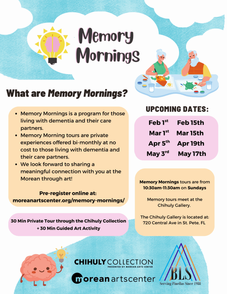 Memory Morning participants will receive a 30-minute private tour of the Chihuly Collection before opening hours, followed by a 30-minute guided art activity inspired by one of the glass pieces in the Chihuly Collection. Memory tours meet every two Sundays a month at the Chihuly Collection, located at 720 Central Ave in St. Petersburg from 10:30am – 11:30am. Â